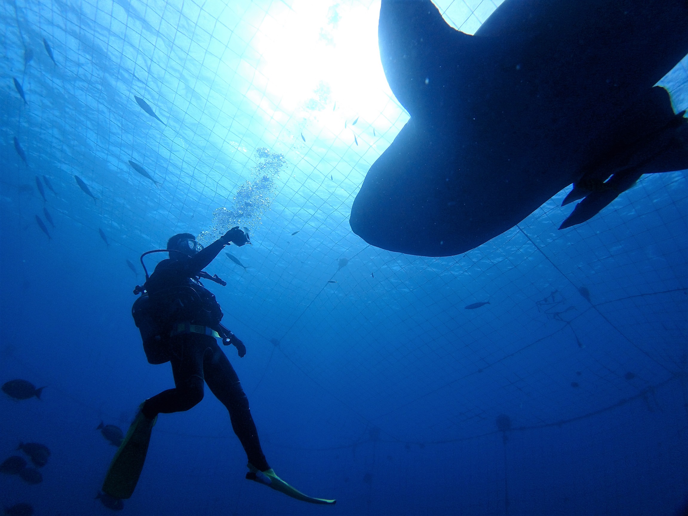 はいさーい!本日は田村さんとジンベイザメツアーに行ってきました!天候も海況も良くなりバッチリでした!初めてのジンベイザメは田村さん少し緊張していましたが大迫力に大満足していただき写真もたくさん撮っていましたね!いいショットはゲットできたでしょうか?今日7m級と5m級の大きなジンベイザメー2匹が悠々と泳いでいました!やっぱりジンベイはすごいでしたね!是非また沖縄で一緒にダイビングしましょう!